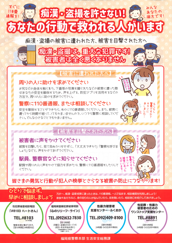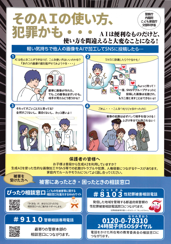 若松警察署の方々、立ち止まってくださったみなさま、ありがとうございました。試験の日でも痴漢の被害にあった場合は、救済措置をしてくれます。一人で悩まずに、まずは近くの大人に相談してくださいね。防犯対策や被害にあった場合の対処法は下記をご覧ください。また、最近AIを使った犯罪(性的ディープフェイク等、下記参照)も急増しています。誰でもが被害者・加害者になってしまう可能性があります。一人ひとりが自覚を持ち、行動しましょう。なにかあれば、すぐに相談してください!