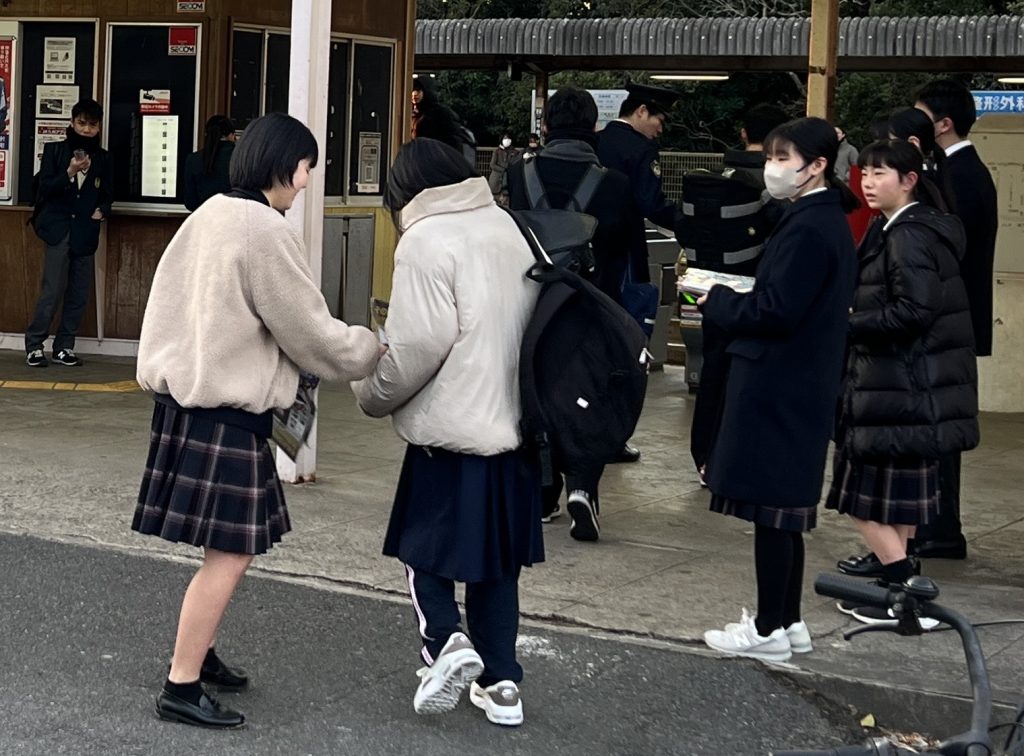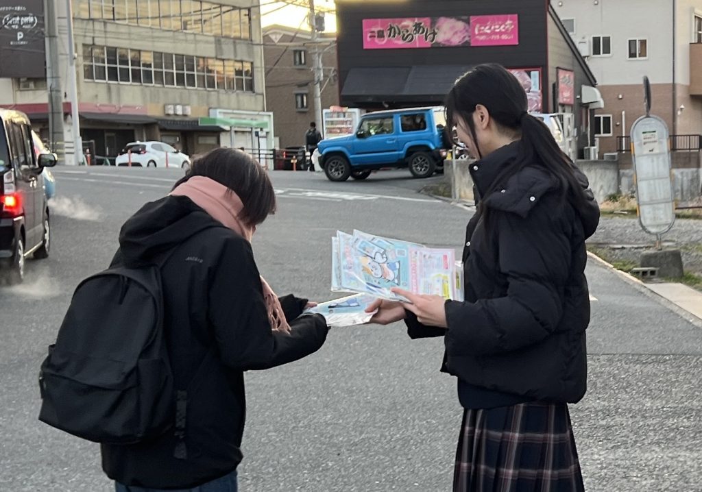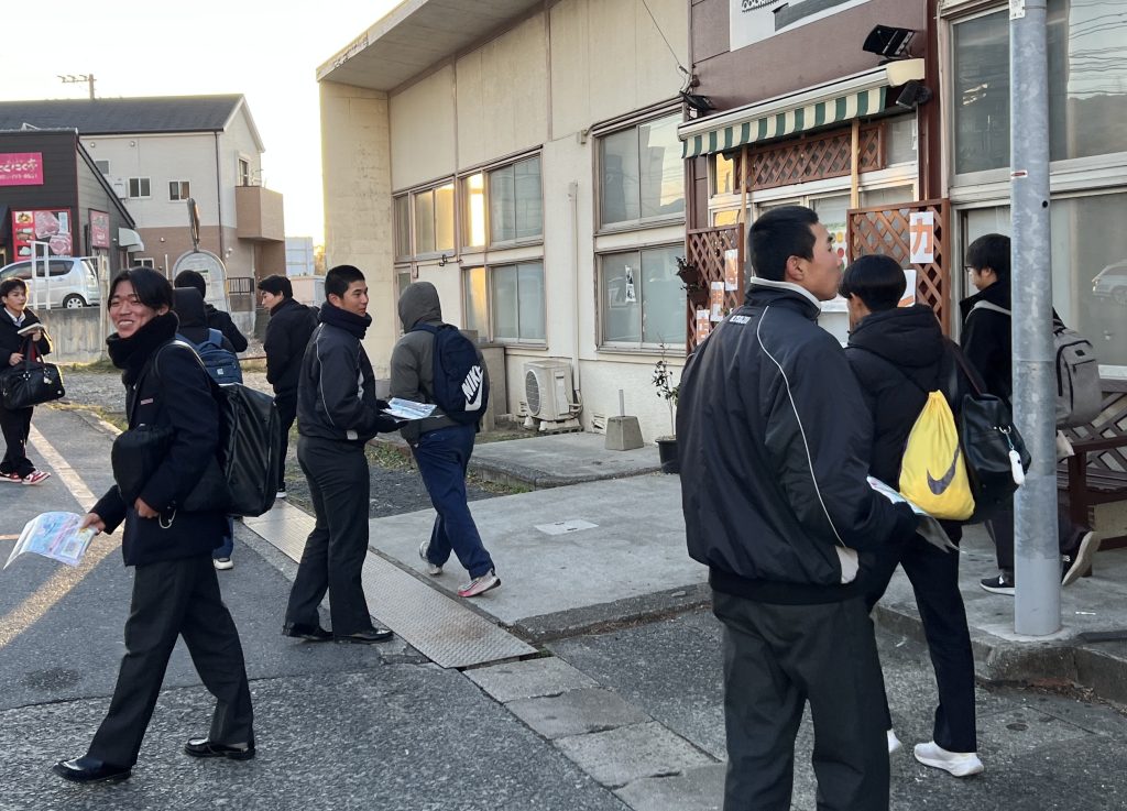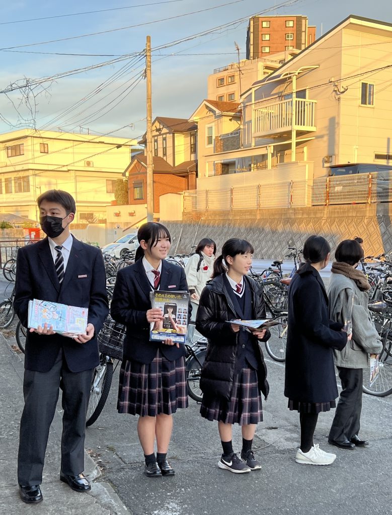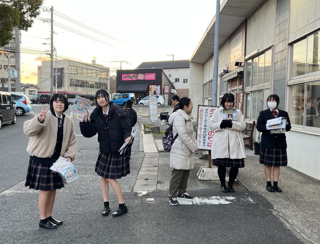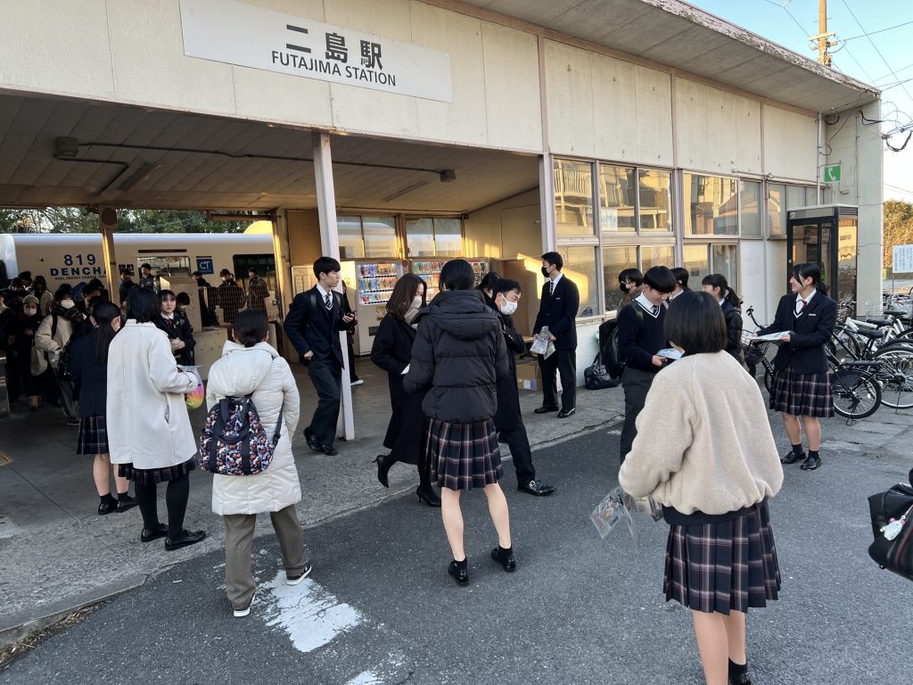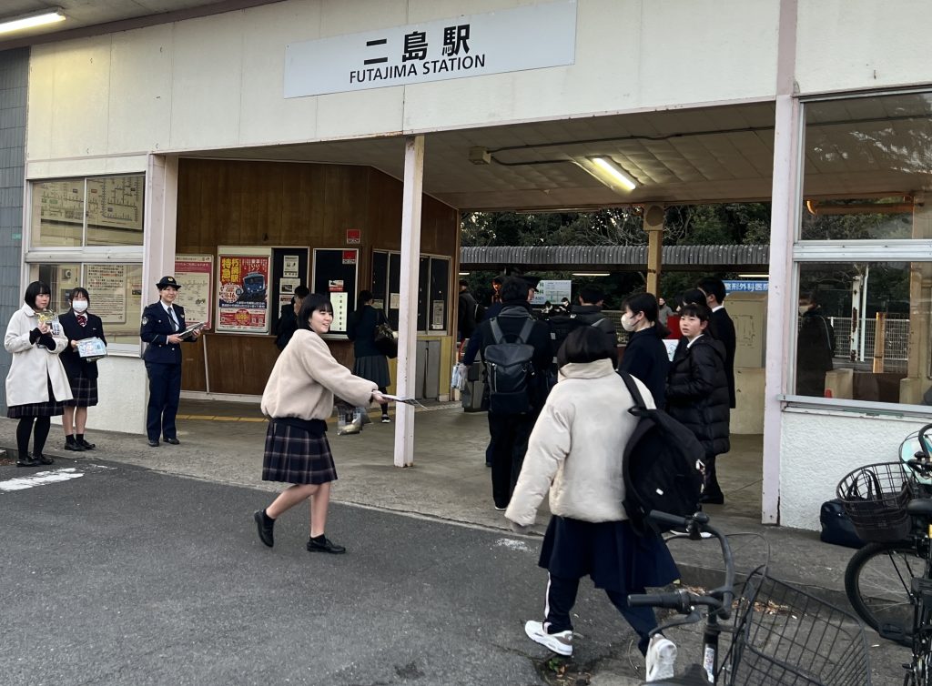いよいよ共通テストまであと3日・・・大事な試験の日は、試験に遅刻できない受験生の心理につけ込み、警察に通報されないと踏んで痴漢行為におよぶ犯罪者が増えるそうです。その痴漢を防止する啓発活動の一環として、本日の朝、JR二島駅前にて若松警察署の警察官の方と一緒に、生徒会役員の生徒たちがフライヤーの街頭配布を行いました。